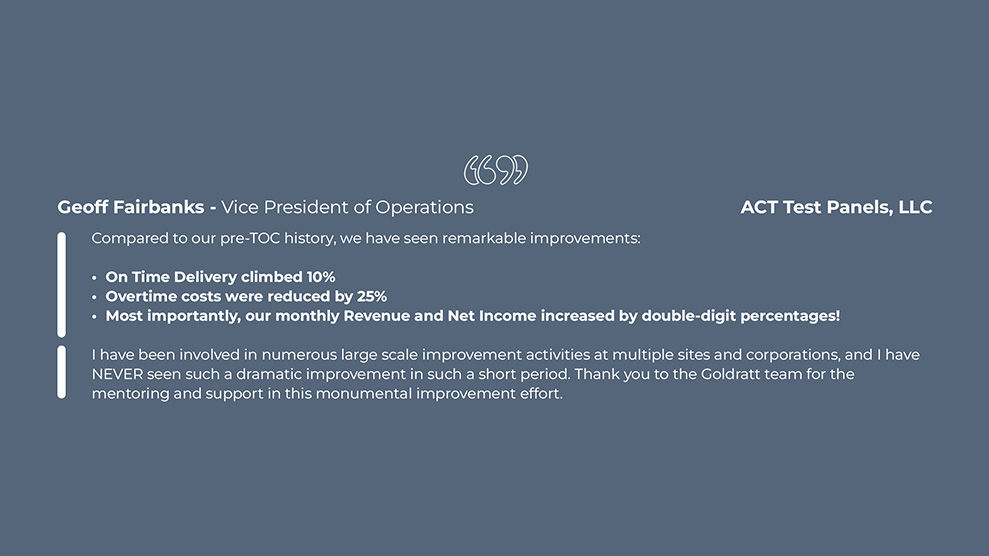 I’ve been involved in numerous large-scale improvement activities at multiple sites and corporations and have NEVER seen such a dramatic improvement in such a short period. Thank you to the Goldratt team.