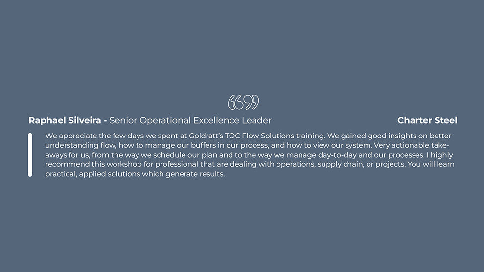Goldratt's TOC Flow Solutions Certificate Program is a hands-on, practical training for companies to leverage operational excellence in production, supply chain, and project environments to achieve a decisive competitive edge.