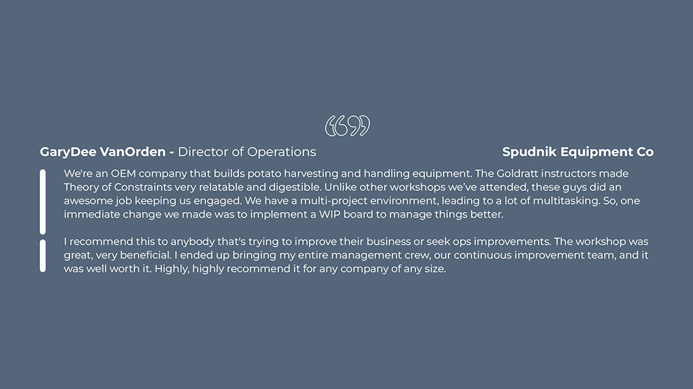 The Goldratt instructors made Theory of Constraints very relatable and digestible. Unlike other workshops we’ve attended, these guys did an awesome job keeping us engaged.